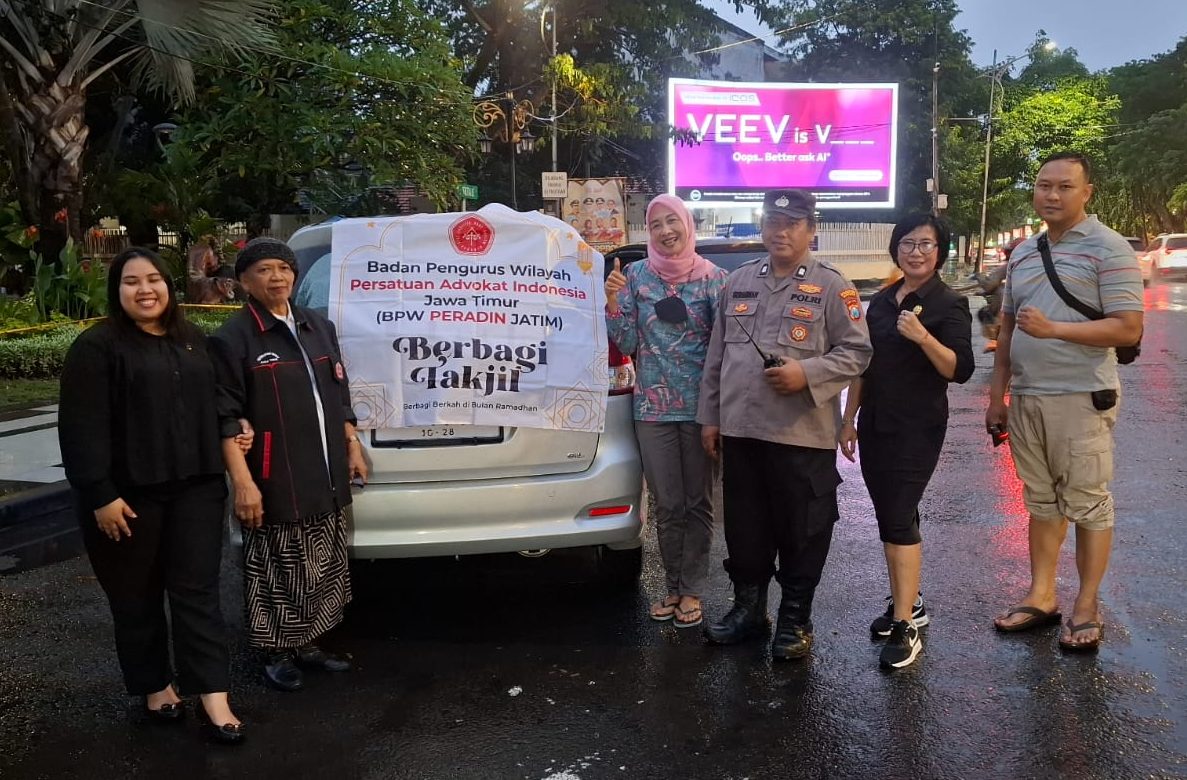 SURABAYA — Semangat berbagi di bulan suci Ramadan ditunjukkan secara nyata oleh Badan Pengurus Wilayah (BPW) PERADIN JATIM. Meski Kota Surabaya diguyur hujan sejak sore hari, para advokat yang tergabung dalam organisasi ini tetap antusias membagikan ratusan paket takjil di depan Kebun Binatang Surabaya (KBS), Jumat (27/2/2026).