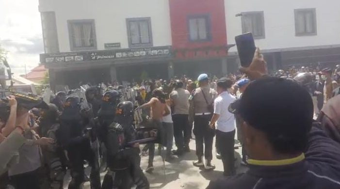Ketegangan akhirnya pecah ketika batu-batu dilemparkan warga ke arah aparat yang melakukan penjagaan, memaksa petugas mundur beberapa langkah untuk menghindari benturan langsung.