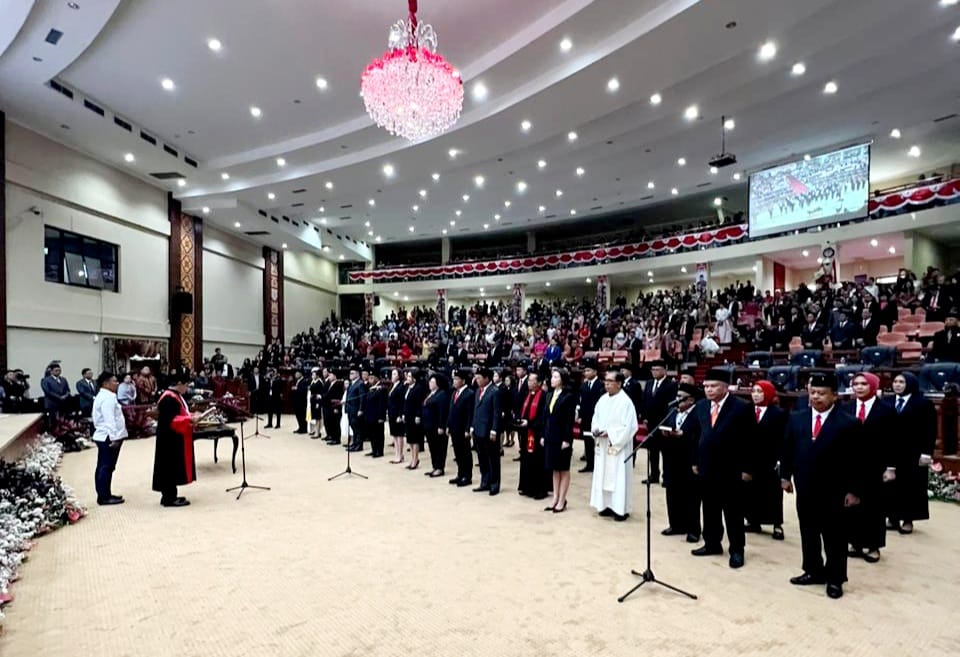 Ketua Pengadilan Tinggi Manado, Ali Ginting, SH, MH, melantik 43 anggota DPRD Provinsi Sulawesi Utara terpilih di ruangan paripurna DPRD Provinsi dalam rapat paripurna istimewa pada Senin (9/9/2024).