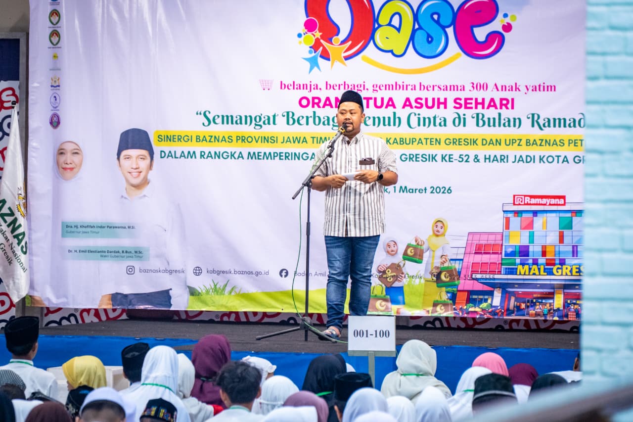 GRESIK — Wajah ceria terpancar dari ratusan anak yatim saat menyerbu pusat perbelanjaan Mal Gresik, Minggu (1/3/2026). Bupati Gresik, Fandi Akhmad Yani (Gus Yani), secara resmi membuka kegiatan OASE (Orang Tua Asuh Sehari), sebuah inisiatif mulia dari Badan Amil Zakat Nasional (BAZNAS) Kabupaten Gresik untuk menghadirkan kebahagiaan menyambut Idul Fitri.