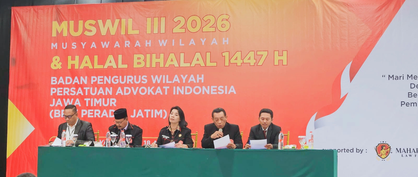 SURABAYA — Badan Pengurus Wilayah Persatuan Advokat Indonesia Jawa Timur (BPW PERADIN Jatim) sukses menggelar Musyawarah Wilayah (Muswil) III Tahun 2026 di Auditorium Gedung Srijaya, Surabaya, Sabtu (18/04/2026). Dalam agenda tersebut, Bambang Rudiyanto kembali terpilih secara sah untuk melanjutkan kepemimpinannya di periode kedua.