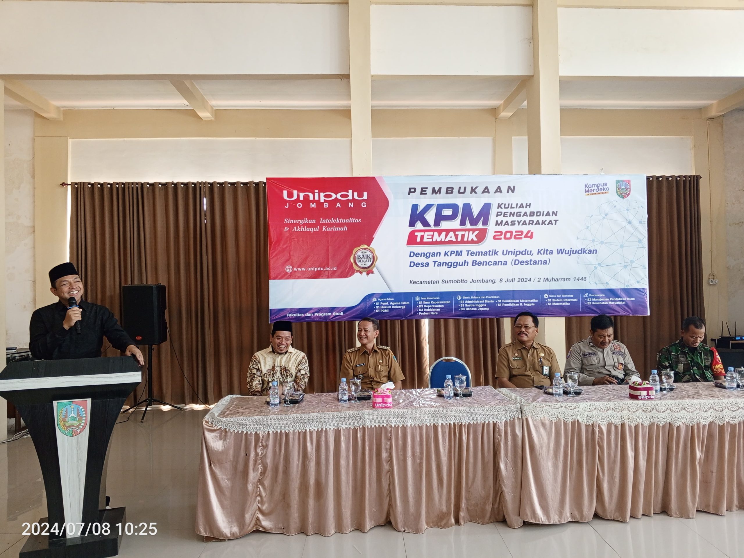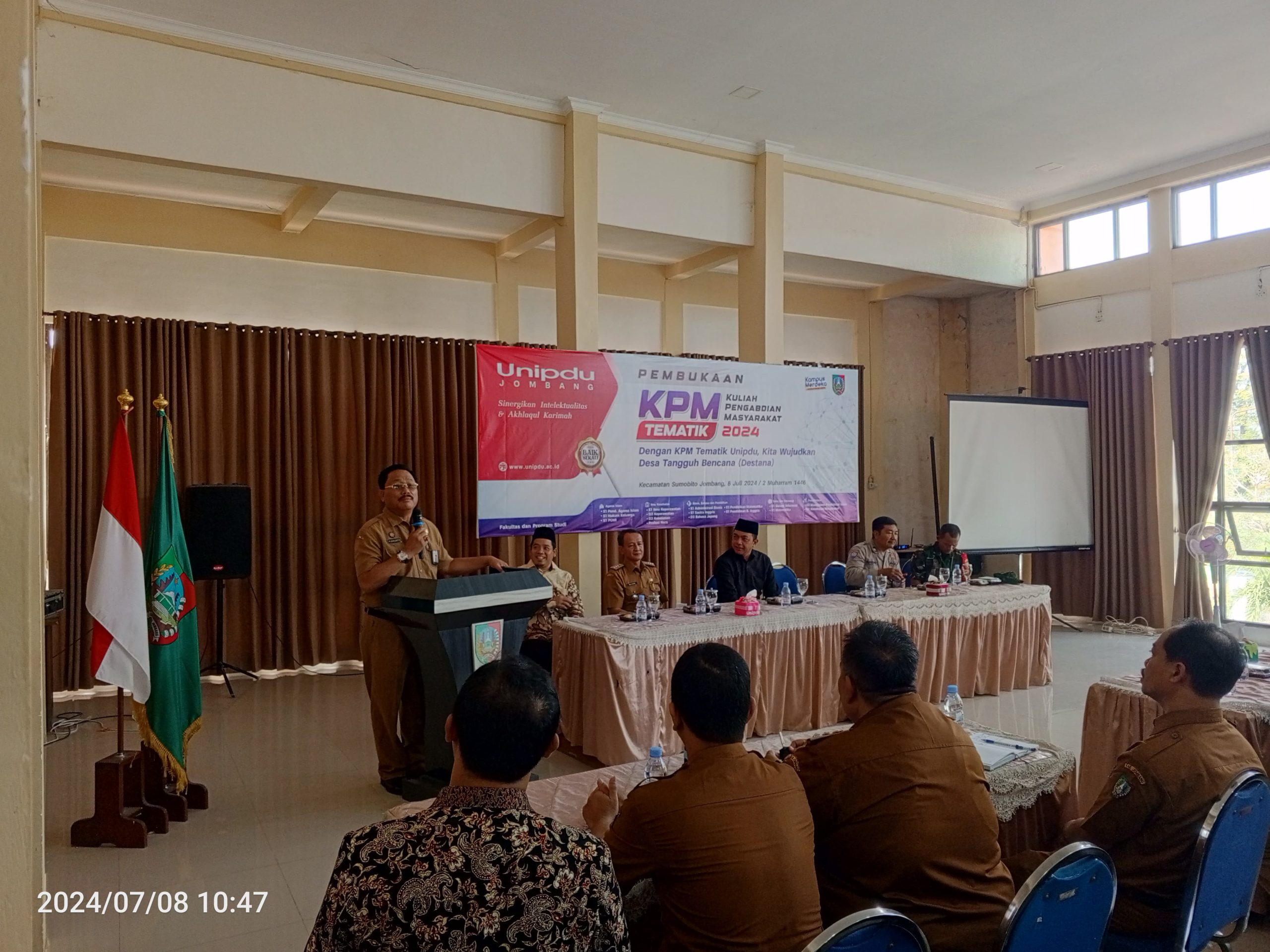 JOMBANG, salamolahraga.com | Pembukaan Kuliah Pengabdian Masyarakat (KPM) dengan Tematik Wujudkan Desa Tangguh Bencana (DESTANA) dilaksanakan di gedung aula kantor Kecamatan Sumobito pada hari Senin 8/7/2024 pukul 10.00 WIB.
