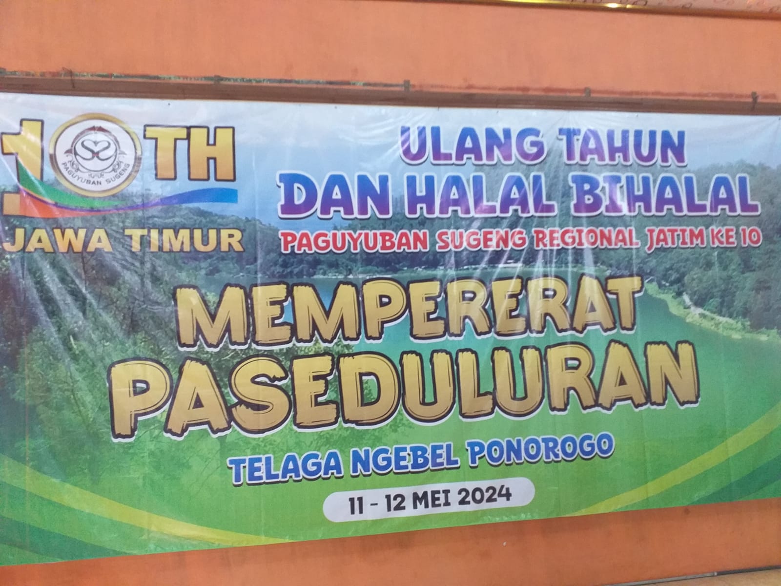 Pada tanggal 11 – 12 Mei 2024, Paguyuban Sugeng Regional Jatim mengadakan acara HUT ke-X serta halal bihalal di Telaga Ngebel Ponorogo Jawa Timur. Dengan mengangkat tema “Mempererat Paseduluran”. Jumlah yang hadir dalam acara tersebut sekitar 75 orang yang memiliki unsur Sugeng, yang terbagi dari komisariat plat AG, AE, S, L, P, N dan dihadiri oleh perwakilan PS Jawa Barat.