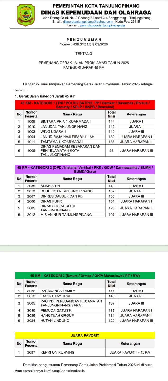 TANJUNGPINANG – Tim Rumah Sakit Umum Daerah (RSUD) Kota Tanjungpinang berhasil meraih Juara 2 dalam Lomba Gerak Jalan 45 Km kategori instansi, yang diselenggarakan dalam rangka memperingati Hari Ulang Tahun (HUT) ke-80 Republik Indonesia. Lomba ini diadakan oleh panitia HUT RI pada 30 Agustus 2025.