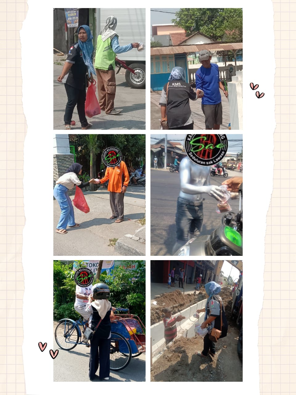 Saatnya team KABARE MOJOAGUNG SAE berbagi ke jalan dengan sasaran yang telah disebutkan diatas. Dimulai dari pertigaan Dsn. Mojolegi Ds. Dukuh Mojo menyisir ke arah utara sampai di pertigaan lampu merah sub terminal Mojoagung. Di sekitar daerah ini mereka menemukan banyak sasaran yang belum kebagian karena minimnya jumlah donasi yang masuk di komunitas KMS. Diharapkan di kegiatan selanjutnya bisa bertambah jumlah donatur dan dermawan yang ikut mensupport kegiatan KABARE MOJOAGUNG SAE.