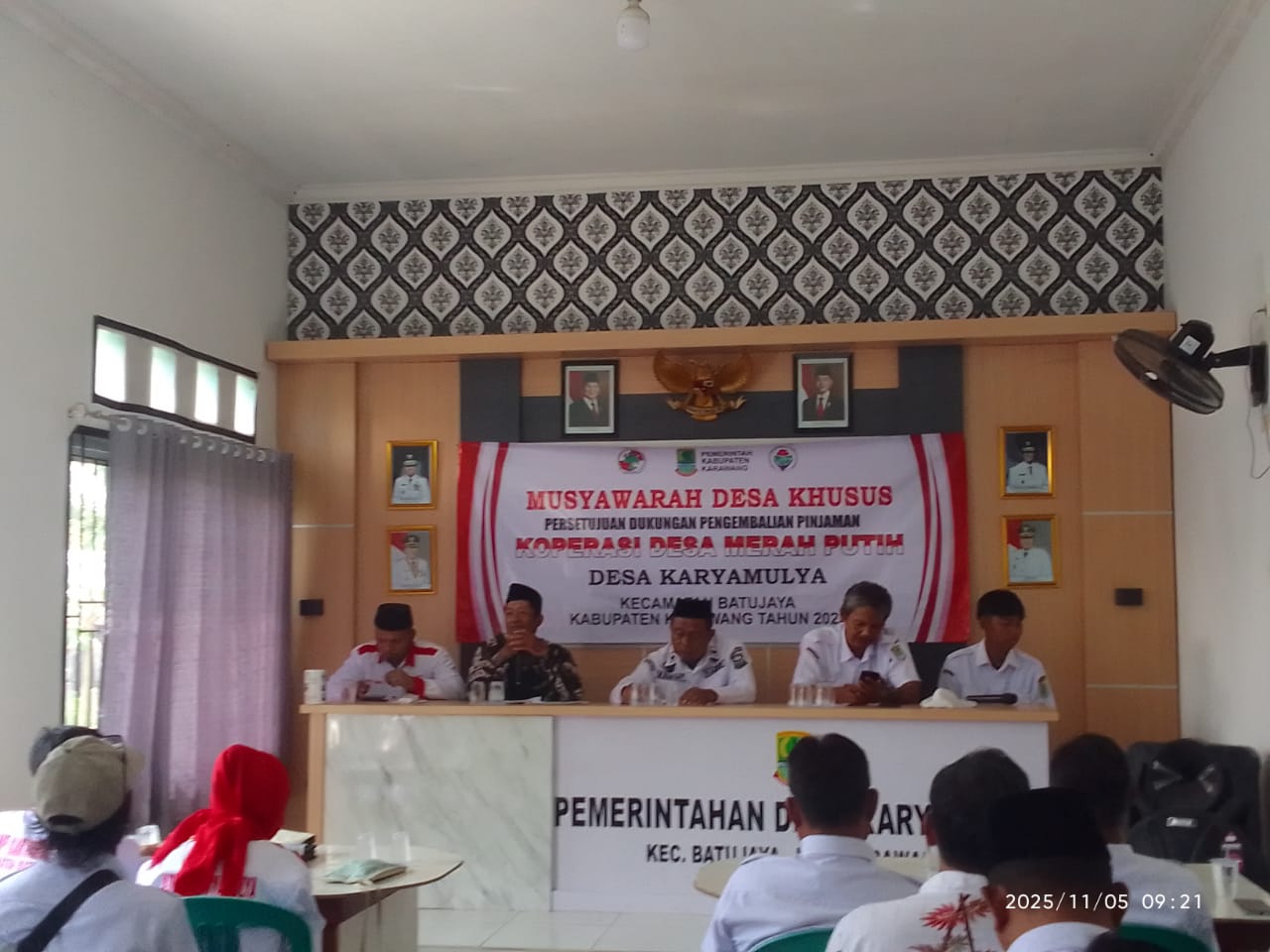KARAWANG – Pemerintah Desa Karyamulya, Kecamatan Batujaya, Kabupaten Karawang, menggelar Musyawarah Desa Khusus (Musdesus) pada Rabu (5/11/2025). Agenda utama Musdesus ini adalah persetujuan dukungan pengembalian pinjaman Koperasi Desa Merah Putih untuk menjamin keberlangsungan ekonomi desa.