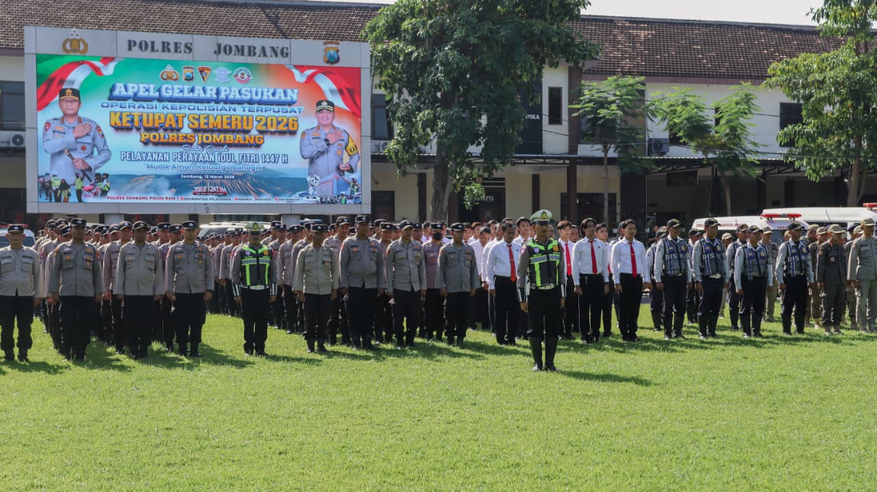 JOMBANG — Guna memastikan keamanan dan kelancaran perayaan Hari Raya Idulfitri 1447 Hijriah, Polres Jombang resmi menggelar Apel Gelar Pasukan Operasi Ketupat Semeru 2026 di lapangan Mapolres Jombang, Kamis (12/3/2026) pagi.