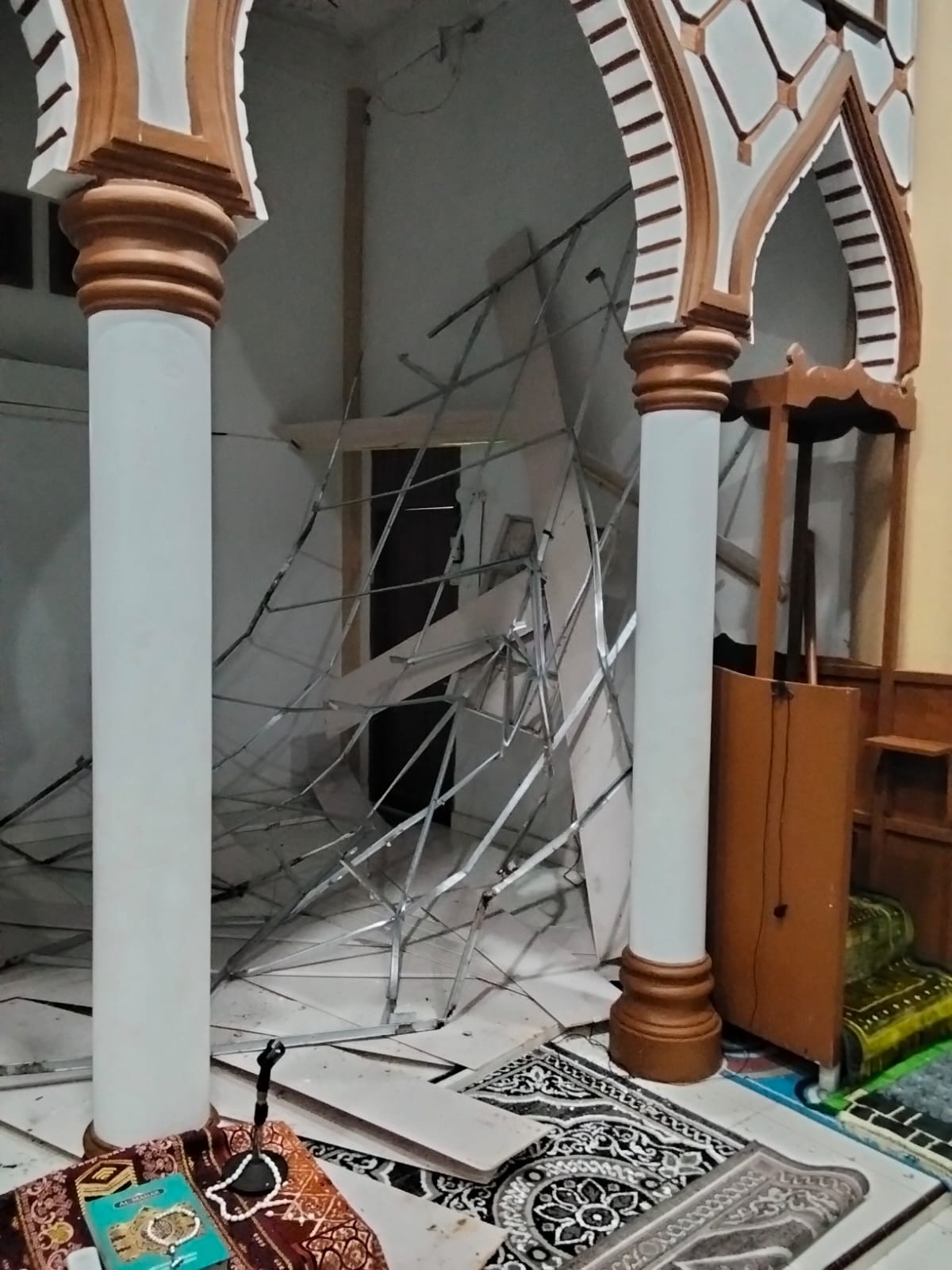 “Material plafon dan rangka besi runtuh ke lantai ruang utama. Kami bersyukur kejadiannya tengah malam saat tidak ada aktivitas jemaah, sehingga tidak menimbulkan korban,” ujar Tgk. Hartadi.