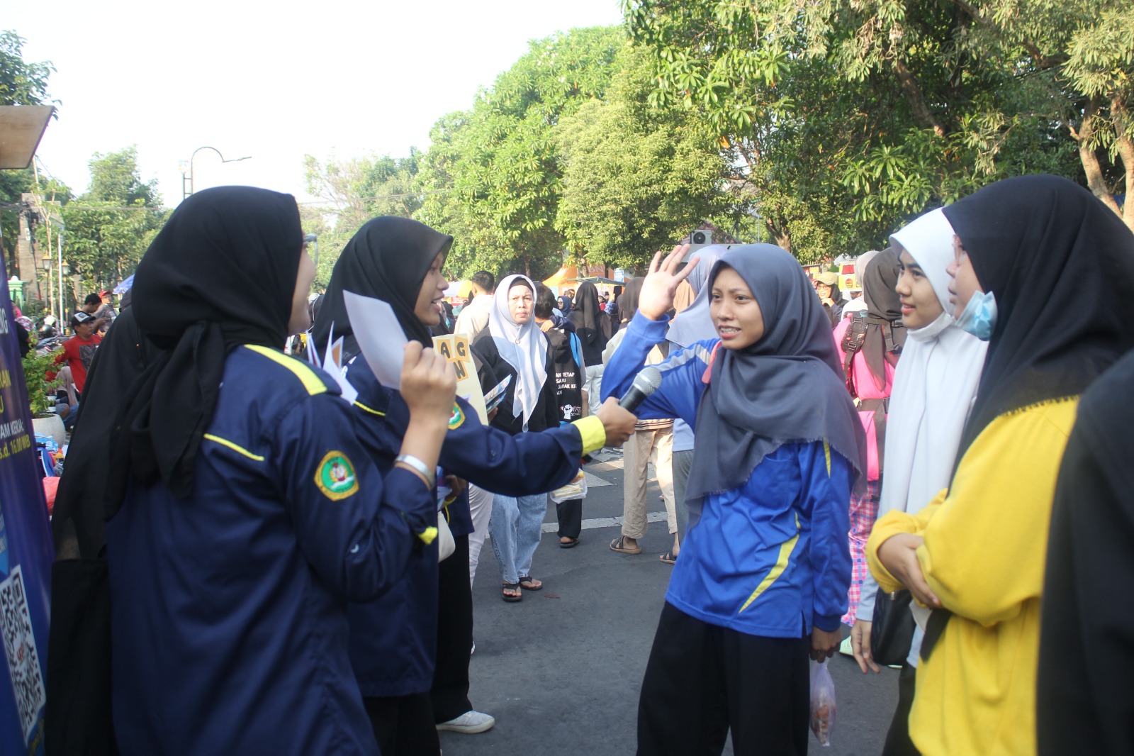 Mahasiswa Prodi (Program Pendidikan) Bahasa Inggris Universitas PGRI Jombang yang multi talenta melibatkan langsung masyarakat yang hadir dalam suasana Car Free Day dengan penuh keceriaan dalam menggunakan bahasa inggris melalui media kuis dan mini games yang sangat mengasikkan dan penuh edukasi tentunya.